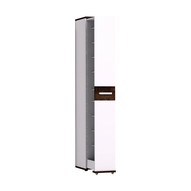 Высокая и узкая обувница - уникальное предложение на рынке мебели. Узкая обувница поможет аккуратной хозяйке разложить до 18 пар обуви, а также средства по уходу за ней. Шкаф выдвигается без усилий благодаря шариковым направляющим полного выдвижения и выкатным роликам. Предусмотрена право- и левосторонняя сборка модуля. Особенности:Регулируемые опоры,Выкатной ролик,Стальной прут 10 мм диаметром,Ручки из массива дерева Материалы:ЛДСП16 мм,ЛДСП22 мм,Кромка ПВХ0,45 мм,Кромка ПВХ2 мм,Шариковые направляющие.