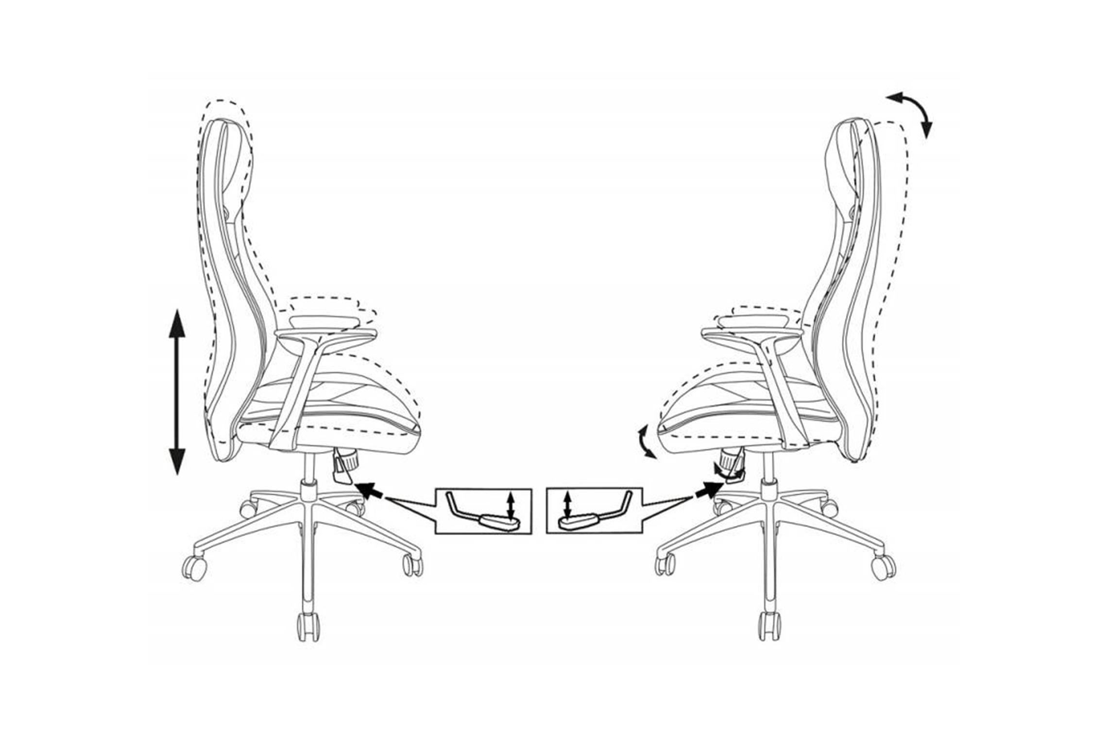 Диаметр колес - 6 см. Высота сиденья - 55 см. Высота с подлокотниками - 75 см. Ширина сиденья - 51 см. Глубина сиденья - 43 см. Материал колес - с накладкой PU. Синхромеханизм качания с регулировкой под вес и фиксацией в нескольких положениях. Подлокотники металлические (полированный алюминий) с мягкими кожаными накладками. Крестовина металлическая (полированный алюминий)